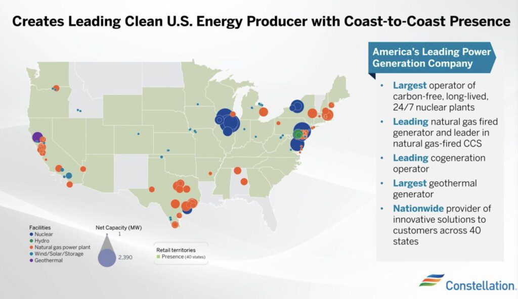 The newly combined Constellation-Calpine generation portfolio spans nearly 60 GW of capacity across the U.S., Canada, and Mexico, featuring a diverse mix of nuclear, natural gas, geothermal, solar, wind, and battery storage assets. Courtesy: Constellation