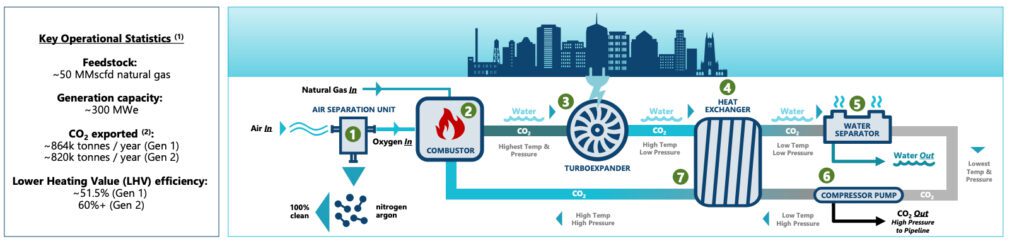 NET Power’s platform uses a semi-closed loop cycle that inherently captures CO2 and produces power. It does so by combining two processes: oxy-combustion, which produces CO2 and H2O, with a supercritical carbon dioxide power cycle (that was formerly referred to as the Allam cycle but is now branded as the NET Power cycle). The CO2 from oxy-combustion is recirculated back to the combustor and a portion (~820,000 tonnes per year for the second-generation design) is exported for utilization or sequestration. Courtesy: NET Power