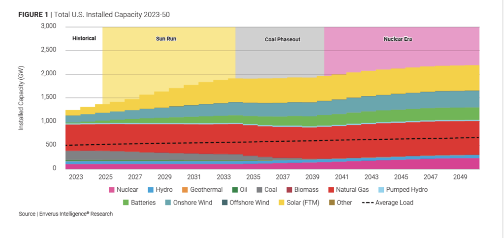 EIR projects a 57% increase in installed U.S. power capacity by 2050. The group said it expects rapid solar energy growth through 2028, despite a more difficult regulatory environment. EIR said it expects remaining coal-fired generation will be replaced by natural gas, and also nuclear power, with what the group said would be “steady long-term growth led by the ramp-up of the U.S. nuclear industry.” EIR said renewable energy installations are expected to peak in 2028, but will remain competitive into the future, “supported by ongoing demand for power purchase agreements (PPAs) and low costs.”